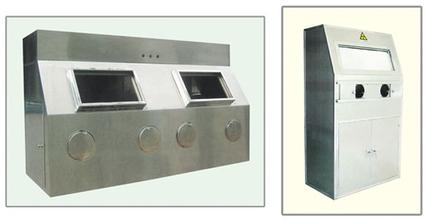 1、放射性同位素源分裝裝置,由箱體、機械手、抓取放射源瓶及開瓶蓋機構、放射性同位素源分裝機構,照明及排氣機構組成,其特征在于:a、機械手由弧形鉗口、彈簧、拉線、控制桿組成,在箱體的內(nèi)壁上固定有一層不銹鋼薄板,在箱體后壁正中偏上處設有機械千,機械手通過球體與箱體相連接,機械手前端安裝有兩個弧形鉗口,鉗口根部安裝有彈簧,鉗口的根部與拉線相連,拉線的另一端與控制桿相連;b、抓取放射源瓶及開瓶蓋機構由吊架、齒輪、齒條、軸、操作手輪、卡頭組成,吊架上裝有齒輪與齒條,齒輪與齒條嚙合,齒輪裝在軸上,軸兩端裝有扭簧,并通過聯(lián)接軸與箱體外面的操作手輪相連,軸與裝扭簧的固定盒都固定在吊架上,齒條內(nèi)孔固定有電機,減速器通過聯(lián)軸節(jié)、軸承與輸出軸連接,壓蓋將齒條下端密封,卡頭通過螺釘與輸出軸活動連接,吊架由螺栓固定在箱體上;c:放射性同位素源分裝機構由分裝罐,球形閥門、計量指示器、觀察鏡、釋放器組成,分裝罐由內(nèi)外兩層不銹鋼筒做成,夾層由鉛充實,分裝罐的下端裝有球形閥門,并引出箱體的外面與手柄相連,分裝罐內(nèi)設浮子,通過引線引出箱體外經(jīng)兩滑輪與計量指示器相連,計量指示器的下端連接有重錘,箱體的右側設有裝源觀察鏡,觀察鏡內(nèi)設互成45度角的兩片鏡片,在觀察鏡上片的背后固定有屏蔽鉛板,箱體右側下部設有釋放器及固定裝置,井通過球體固定在箱休上。